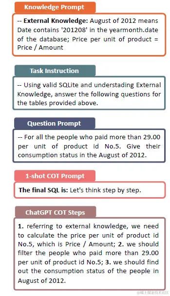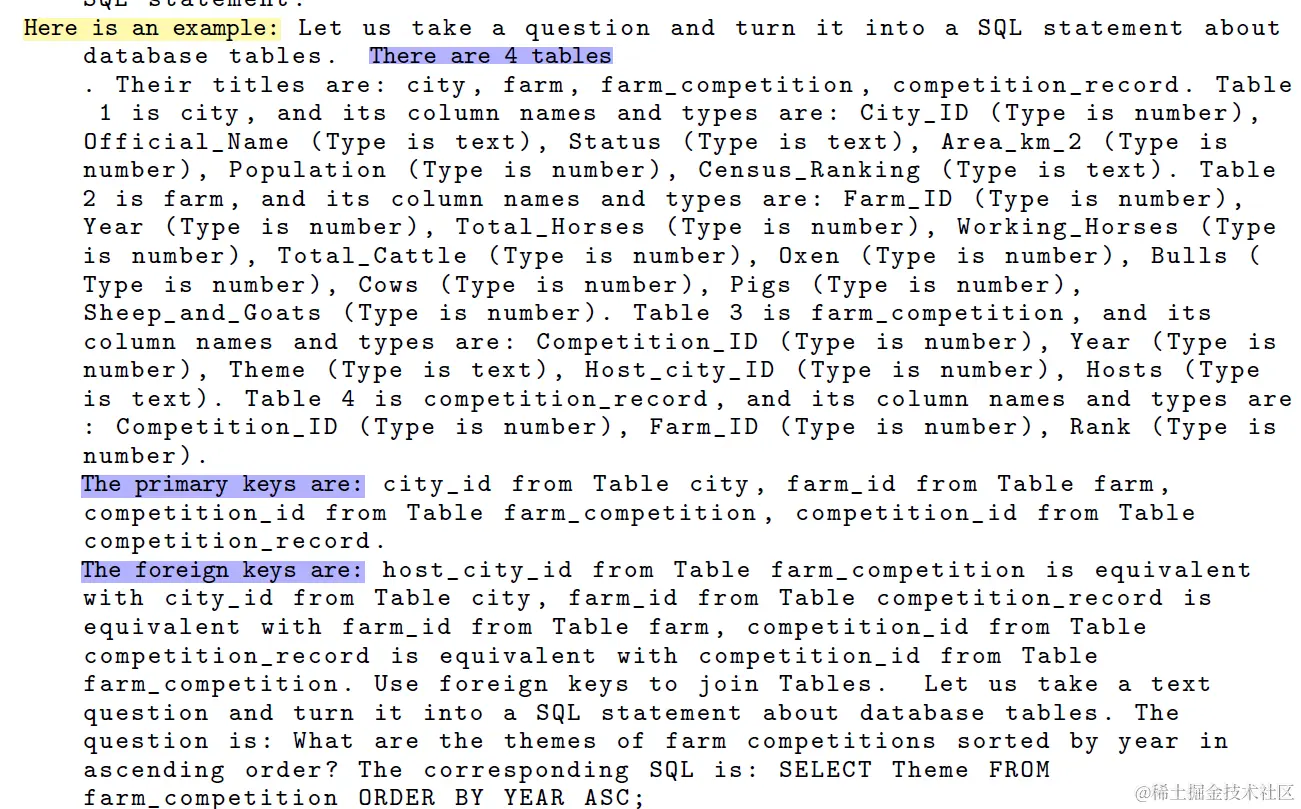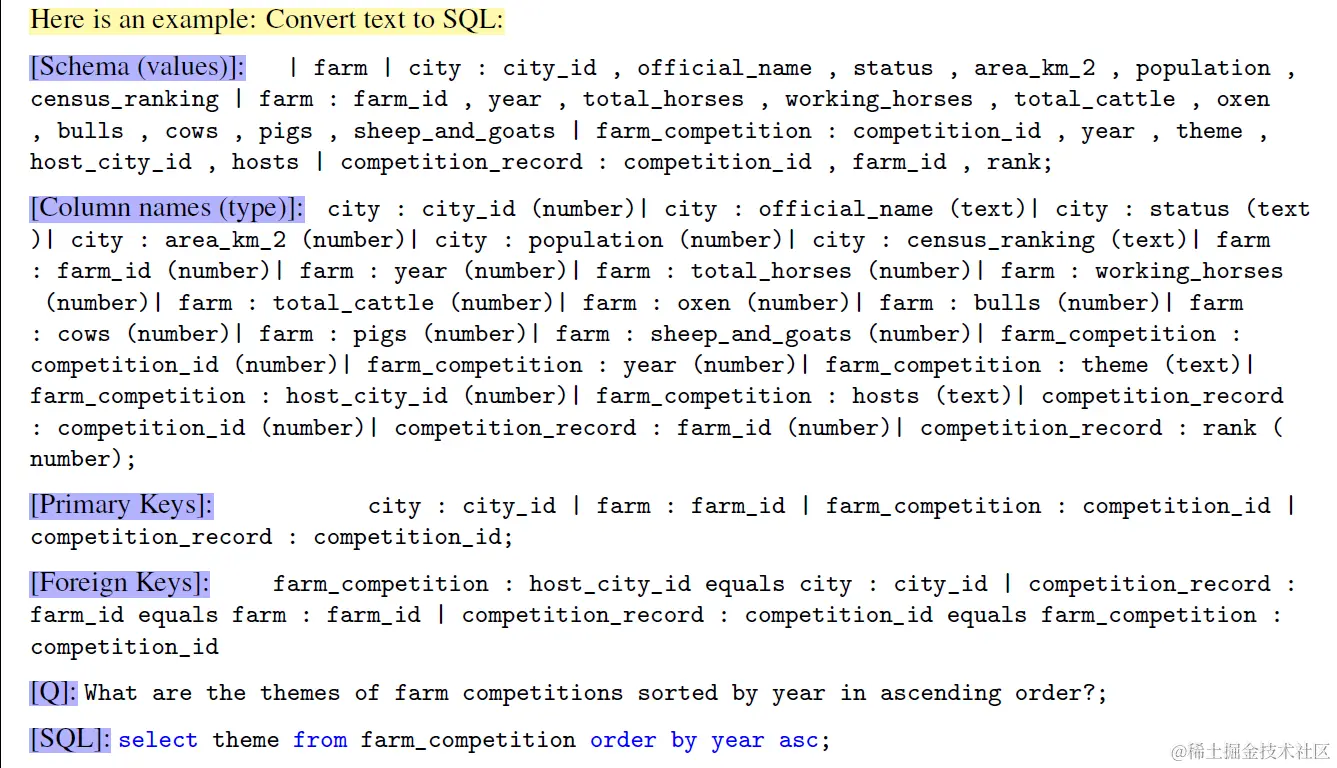 BIRD在人工进行数据标注时,对每张表都提供了对应的以上字段描述和补充知识信息,用来帮助标注同学理解表内容。在使用大模型生成SQL时,以上知识会作为prompt输入模型,如下
