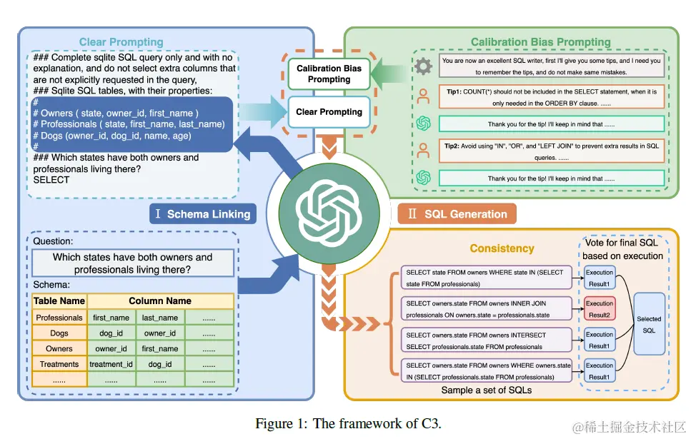 在DIN-SQL提出的Few-shot方案的基础上,C3使用chatgpt作为基座模型,探索了zero-shot的方案,这样可以进一步降低推理成本。并且在生成效果上和DIN-SQL不相上下。