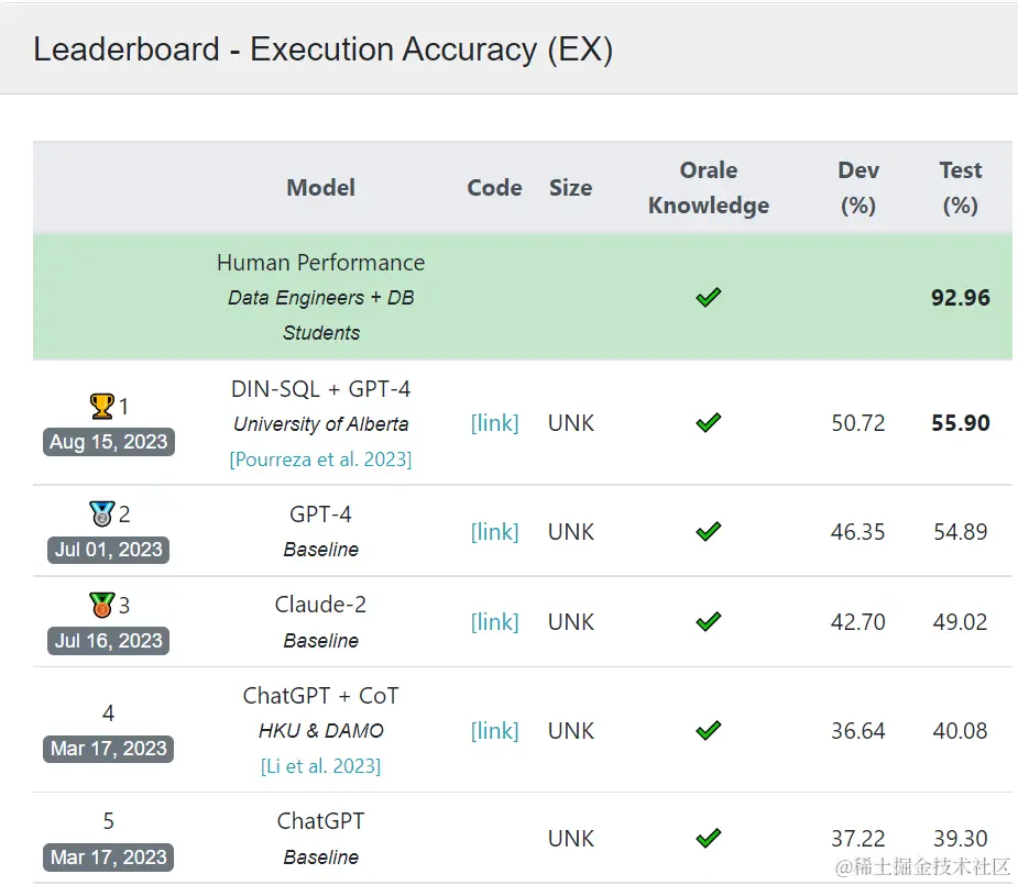 如果说前三篇还有一丢丢“象牙塔文学”,那BIRD确实一步跨入了纪实文学的领域。论文的核心是推出了新的更贴合实际应用场景的超大规模+存在数据噪声+依赖领域知识的NL2SQL基准数据集。在该数据集上,虽然DIN依旧是SOTA,但是和人工标注的执行准确率对比来看,只能说“前路阻且长”