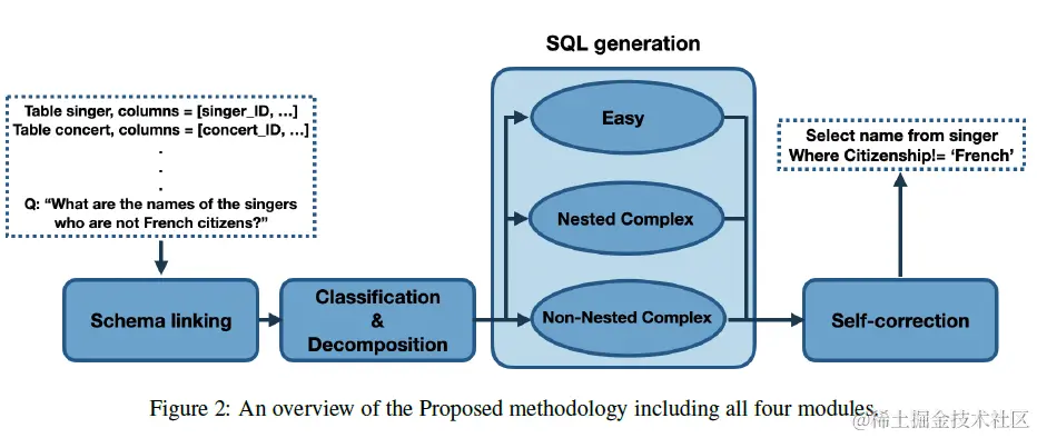 DIN-SQL是当前Spider榜单上的榜一大哥。走的是子问题拆解的方案,把SQL生成的任务像思维链一样拆解成几个固定的任务,串联执行,主要包含以下4个模块