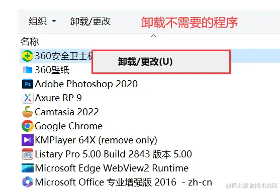 步骤2: 【卸载/更改】 即可卸载不常用的程序。