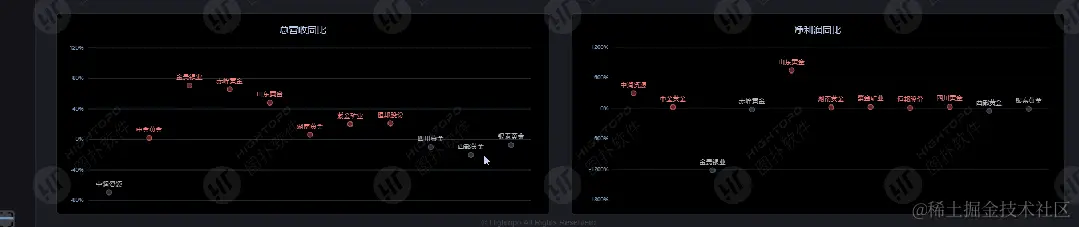 同样,对于企业总营收同比和净利润同比的增加/减少,将点的颜色以红色和灰色作为差异区分,同比增长设为红色,同比减少设为灰色。以贵金属板块中的四川黄金为例,从图表中可以看出 2022 年净利润同比 2021 年减少 10.16%,净利润同比 2021 年增加 29.53%。