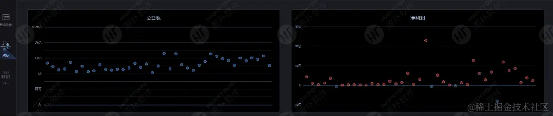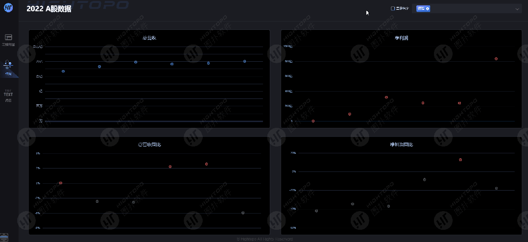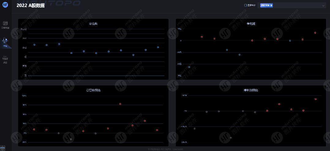 图扑 HT 点图图表中的每个点位,分别代表着 A 股每只股票 2022 年总营收规模、盈利水平,以及总营收同比、净利润同比变化。