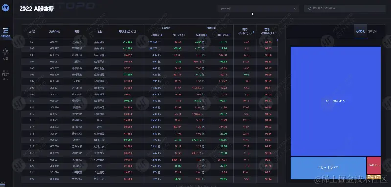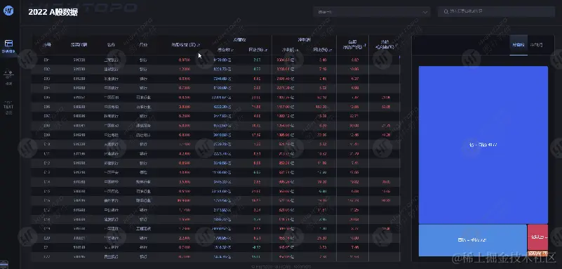 股票数据呈海量化、密集化、多样化的趋势。为了更清晰的比对股票数据,图扑基于自研 HT for Web 产品的 2D 编辑器、UI 库,对2022年 A 股市场数据以 BI 报表形式设计呈现,应用丰富的图表组件,将 A 股总营收、净利润、同比变化等维度的市场数据,选以表格、矩形树图、点图、词云多种动态图表方式,进行清晰、简洁的呈现。