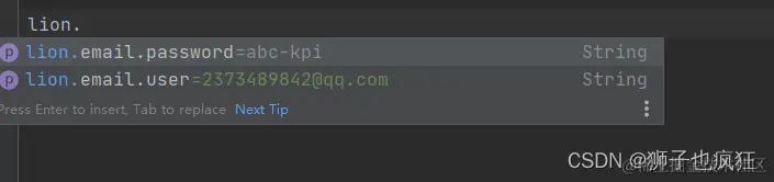 当我们输入lion的时候就会弹出相关提示,这是因为前面3.3节我们添加了Spring Confguration Processor的缘故,自动生成配置的代码提示。