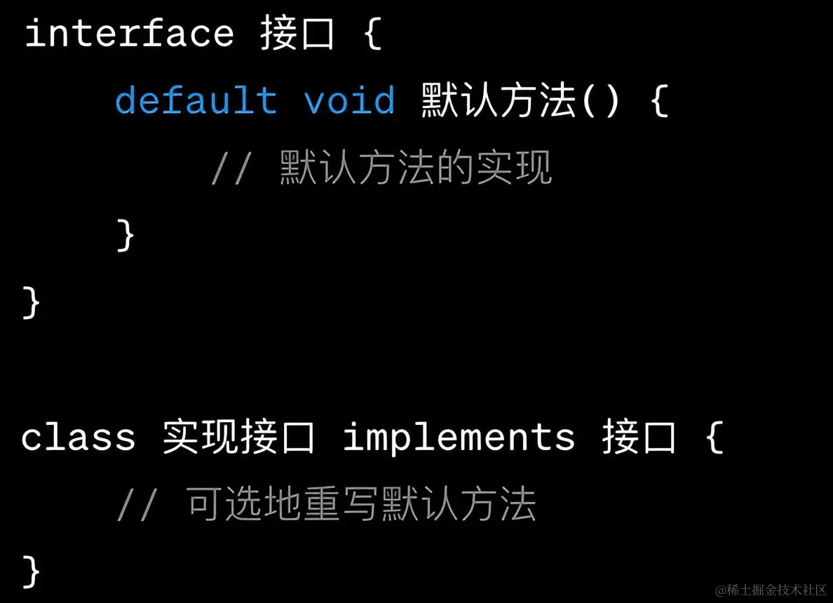 Java 8引入了接口默认方法,允许在接口中提供方法的默认实现。这使得接口也可以包含具体的方法,从而可以在多个类中共享相同的实现逻辑。例如: