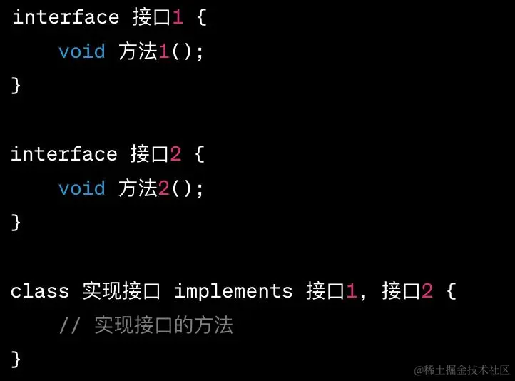 Java中还支持接口继承,这是一种实现多重继承的方式。一个类可以实现多个接口,从而获得多个接口的方法。例如: