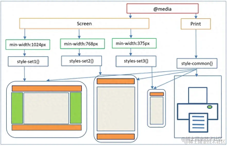 - @media, 如果满足媒体查询的条件则条件规则组里的规则生效。