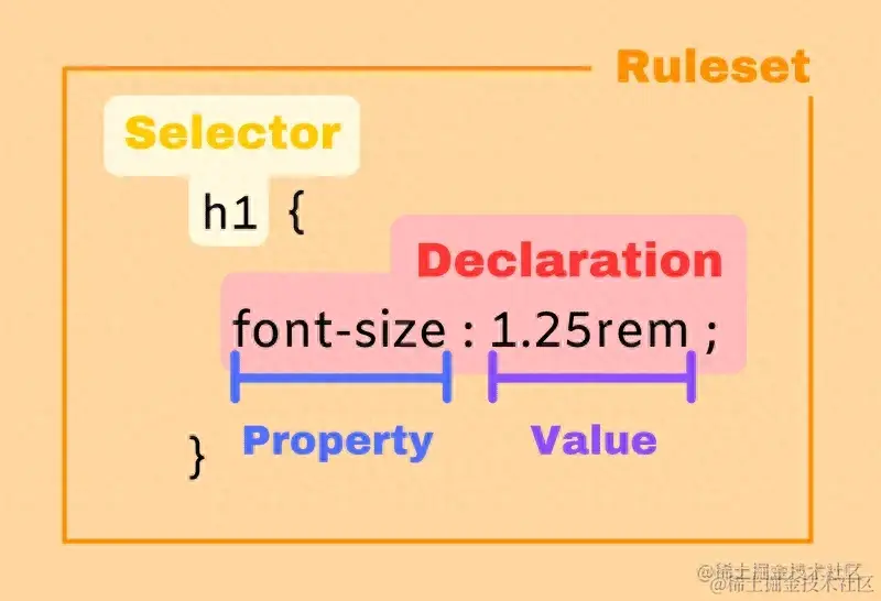 声明块如果需要作用到对应的 HTML 元素,那还需要加上选择器。选择器和声明块组成了CSS 规则集(CSS ruleset),常简称为 CSS 规则。