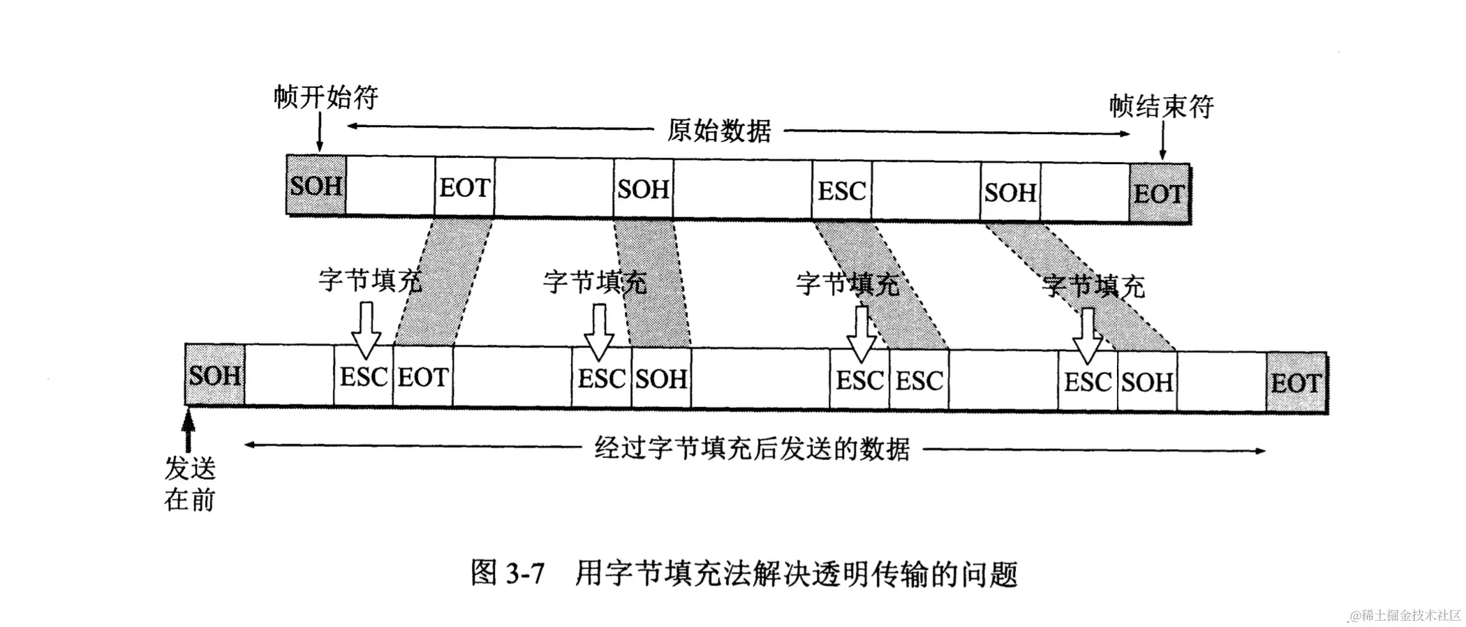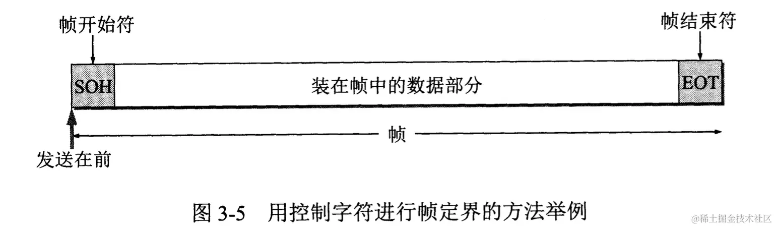 控制字符 SOH ( Start Of Header 放 在 一 帧 的 最 前 面 , 表 示 帧 的 首 部 开 始 。 另 一个 控 制 字 符 EOT ( End Of Transmision)表示帧的结束。它们的十六进制 编码分别是01 (二进制是00000001)和04 (二进制是00000100)。