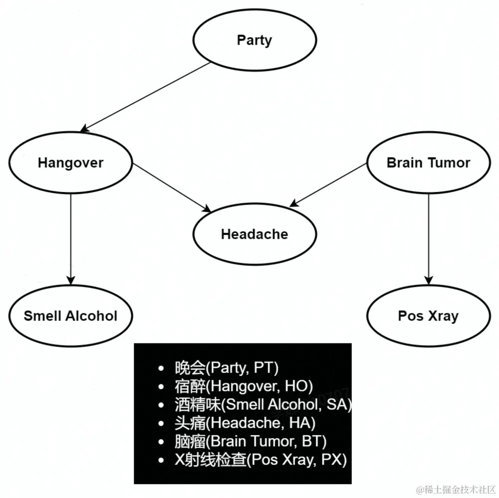 相比任何证据都没有前提下头痛概率0.116,参加晚会和患脑瘤的都发生,某人头痛的概率增加到0.963