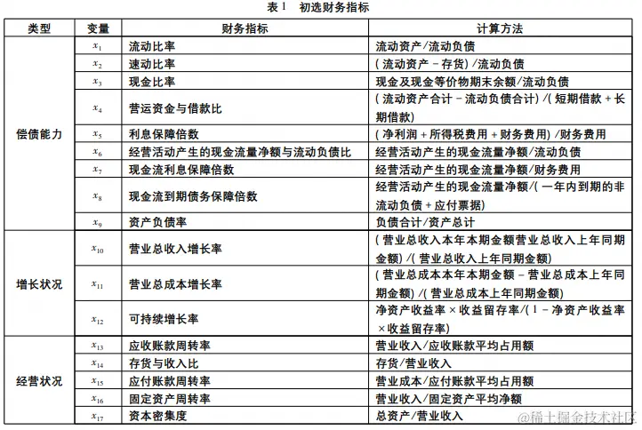 由于问题企业通常存在偿债压力较大、业务增长放缓甚至衰退、周转能力下降等特点,所以从企业偿债、增长、经营三个方面出发初步选取了相应的 17 个财务指标进行分析。选取指标如下表所示。