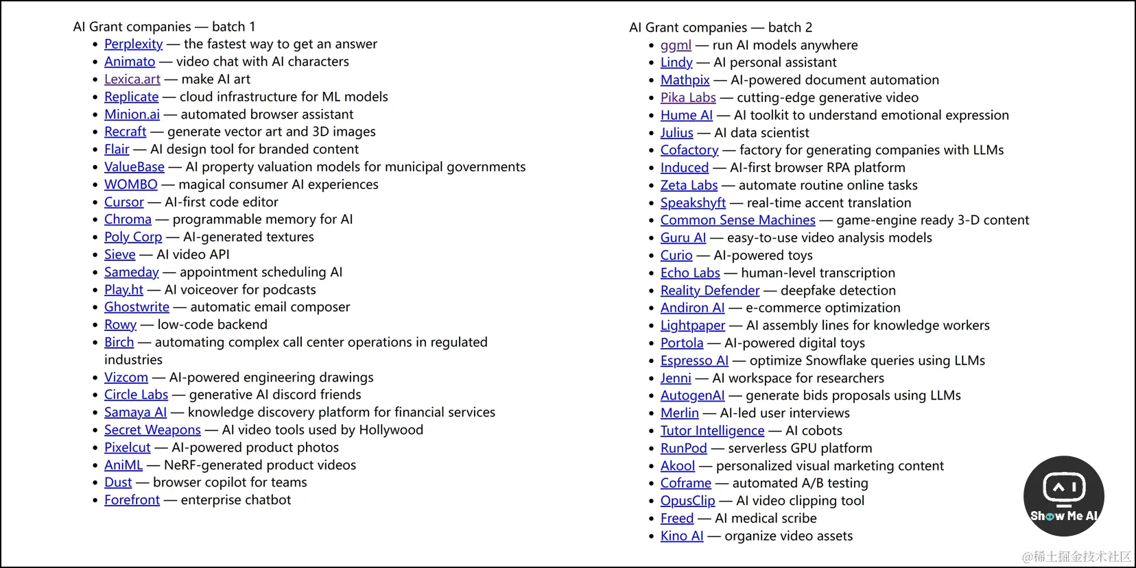 AI Grant 第一期于去年8月开始,一共入选26个项目,包括今年热度很高的AI创业公司Perplexity、Relicate、Dust等。第二期项目于今年6月底开始,竞争空前激烈,并于上周公布了入选名单,一起来看看: