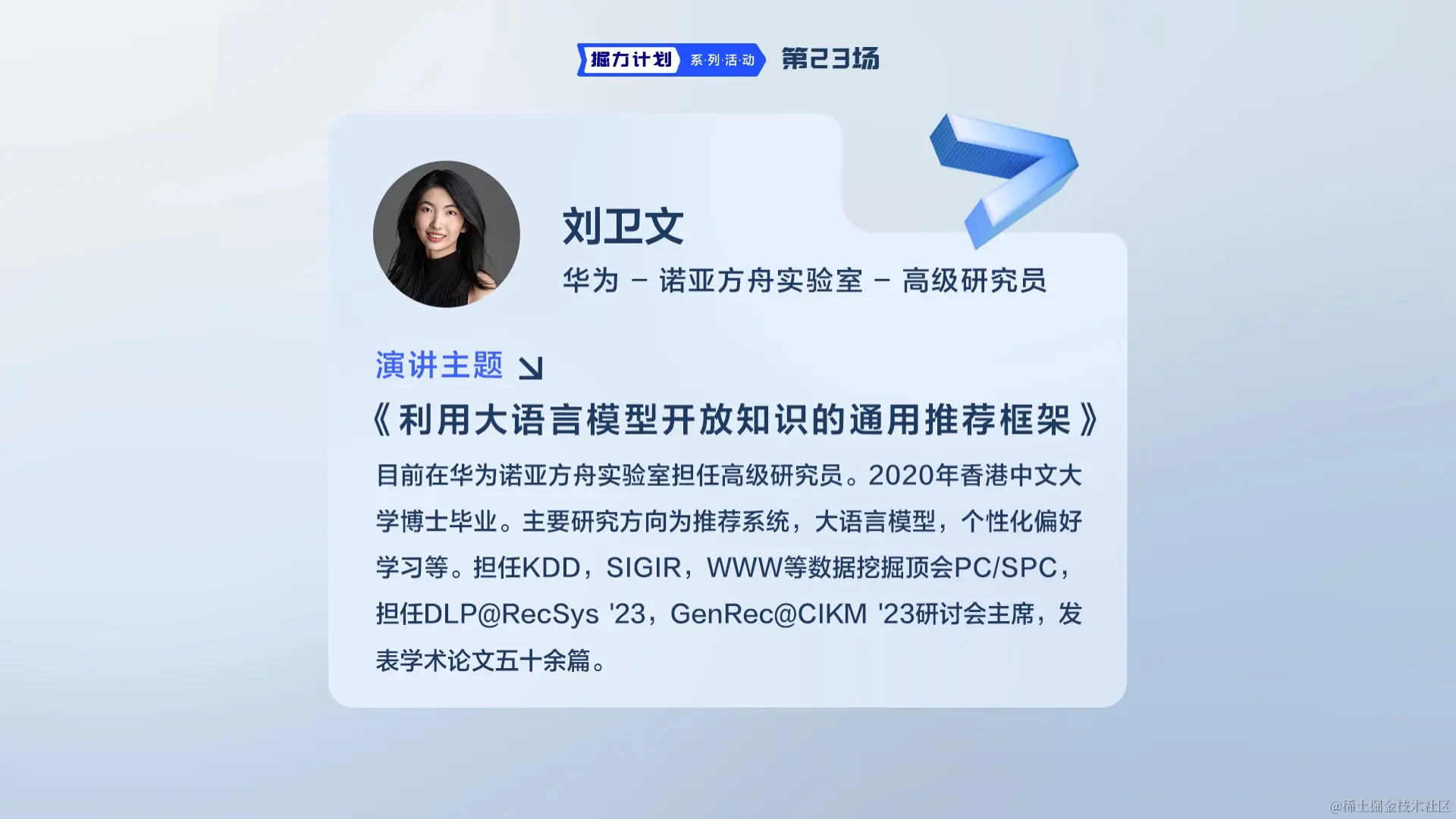 9月9日,掘力计划第23期线上活动举行,本期活动的主题为《AIGC的应用和创新》。来自华为诺亚方舟实验室的刘卫文博士做了题为《利用大语言模型开放知识的通用推荐框架》的分享。