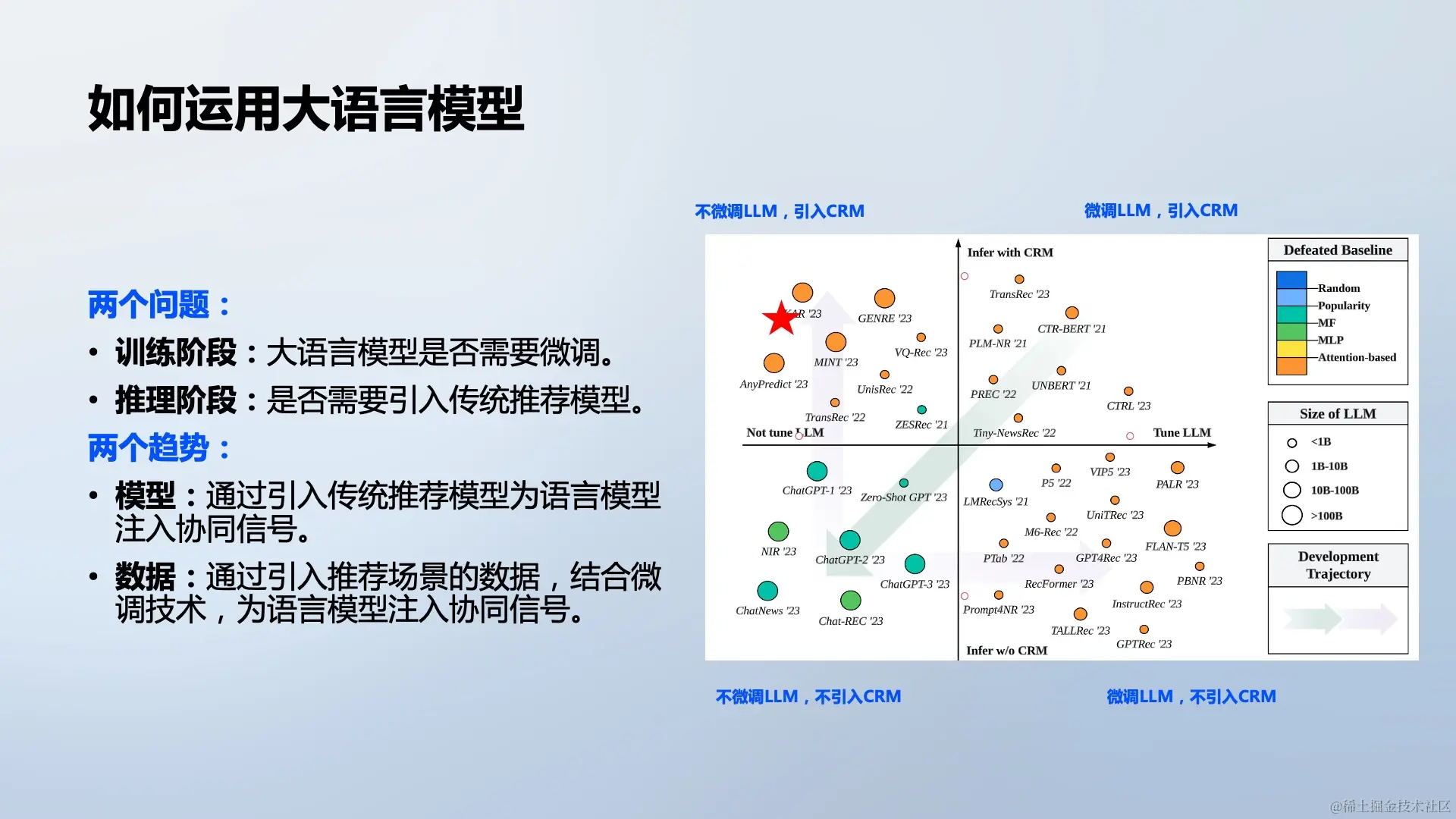 在训练阶段,大语言模型是否需要微调以及推理阶段是否需要引入传统推荐模型,是当前的两大发展趋势: