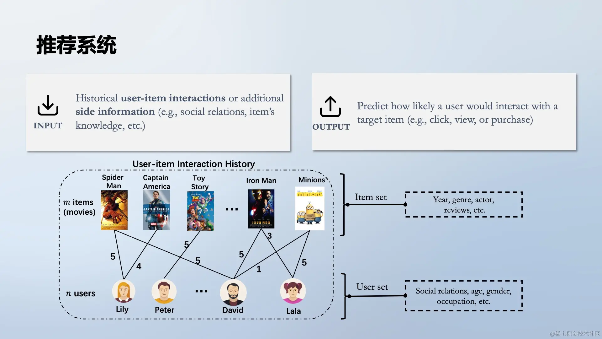从技术角度来看,一个推荐系统的输入主要包括:用户历史交互、物品特征、用户特征。输出是一个针对给定用户U和物品I的匹配概率或评分。推荐系统的目标是预测用户最可能喜欢的内容。