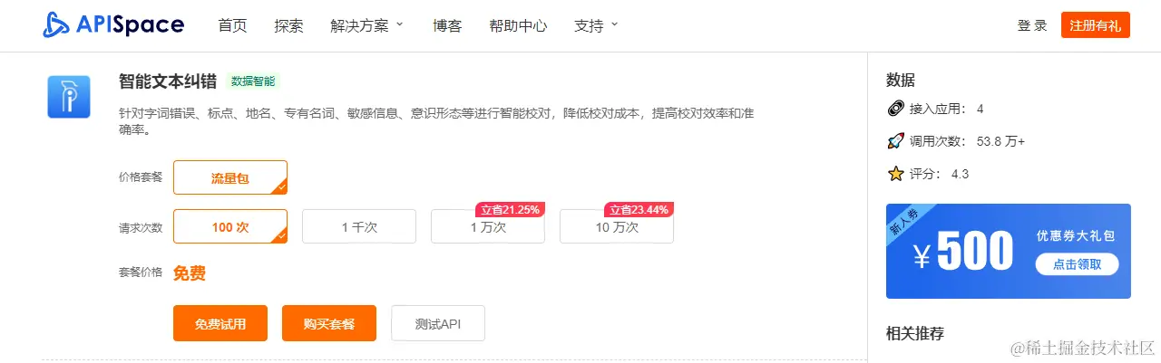 登录 APISpace 进入 【智能文本纠错】详情页,点击【免费试用】,申请接口。
