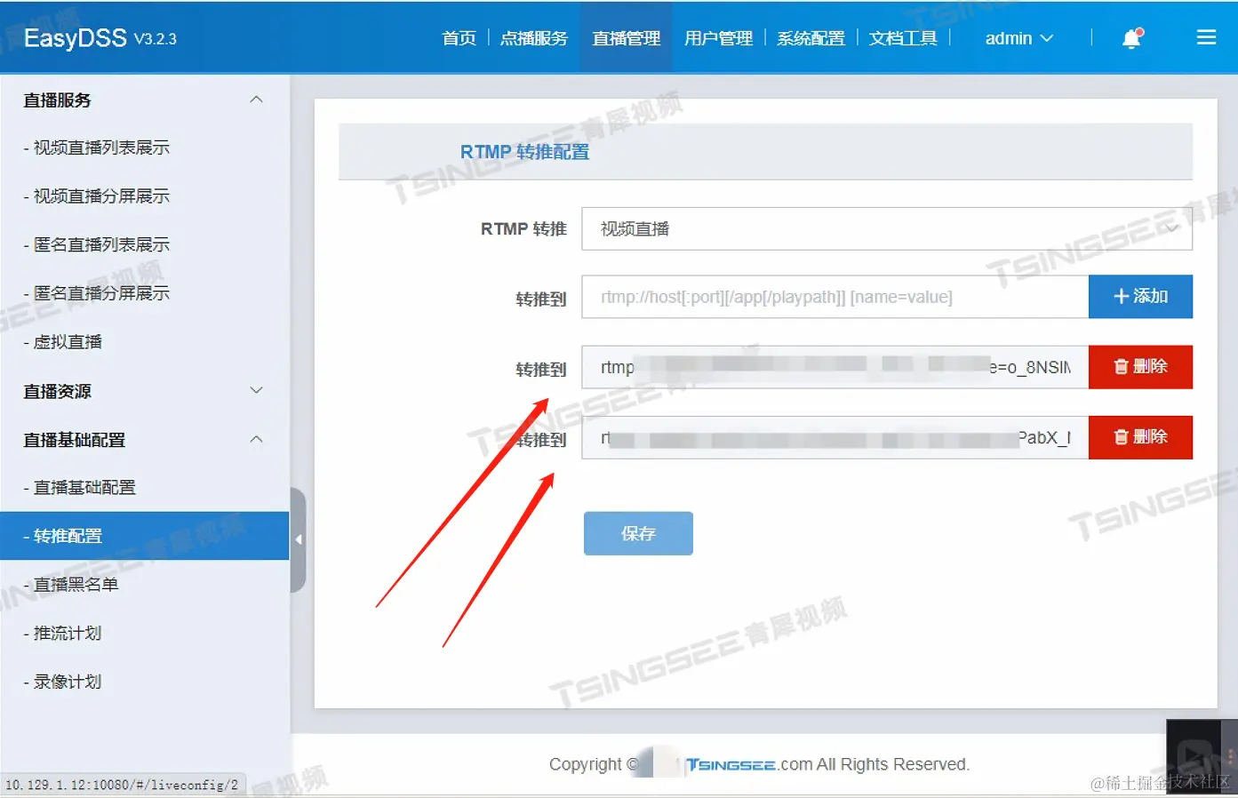 4)看到是正常播放后就可在【直播管理】-【转推设置】中把公网直播间的RTMP推流地址配置到这里;