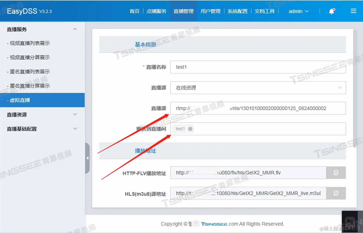 2)部署完毕后,在我们EasyDSS的虚拟直播中,将我们的EasyCVR的流地址输入进去,然后推到相应的直播间中,点击保存;