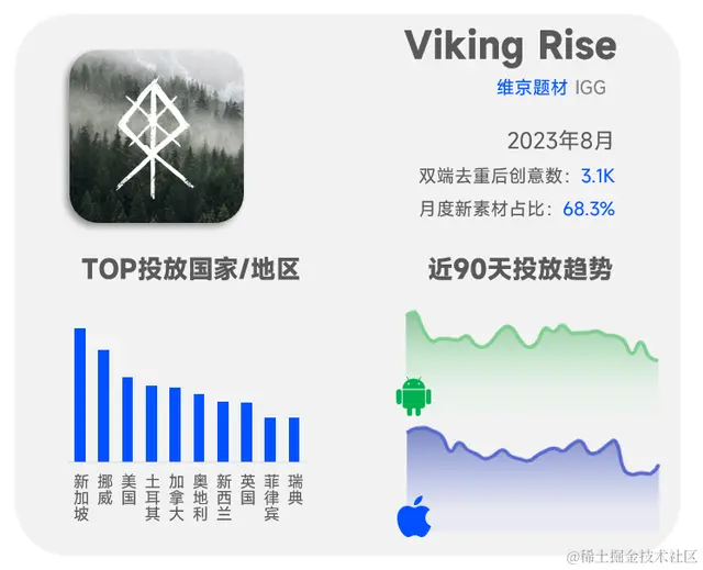 IGG旗下热门维京题材新游【Viking Rise】8月双端累计去重后素材超3100条,Android端具体投放情况如下: