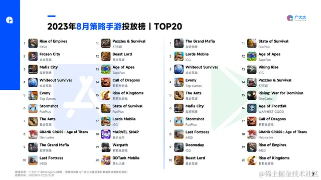 2023年8月策略手游投放榜单TOP20呈现如下趋势: