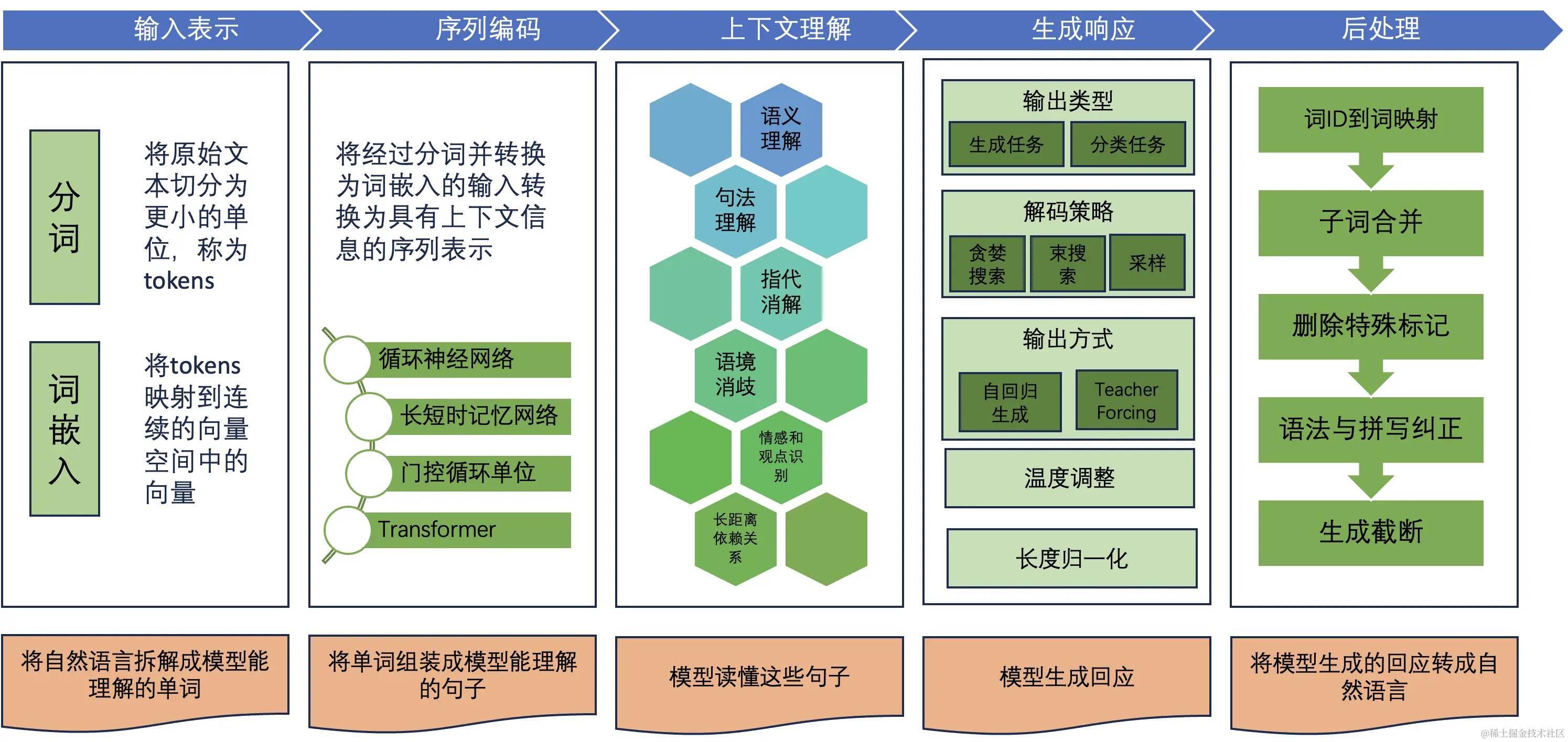 生成的响应会经过后处理,将模型的输出转换为可理解的自然语言文本。这可能包括将词嵌入转换回原始单词、合并子词以及纠正语法错误等操作。后处理是自然语言处理模型生成响应后将模型输出转换为可理解的自然语言文本的过程,通过这一过程,我们可以将NLP模型的输出转换为具有可读性和可理解性的自然语言文本。这一阶段包括: