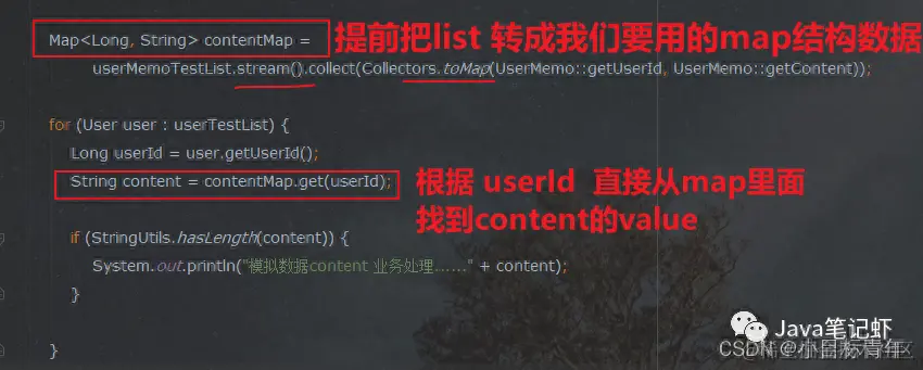 而我们提前对 userMemo list集合 做一次 遍历,转存储在map里面 。
