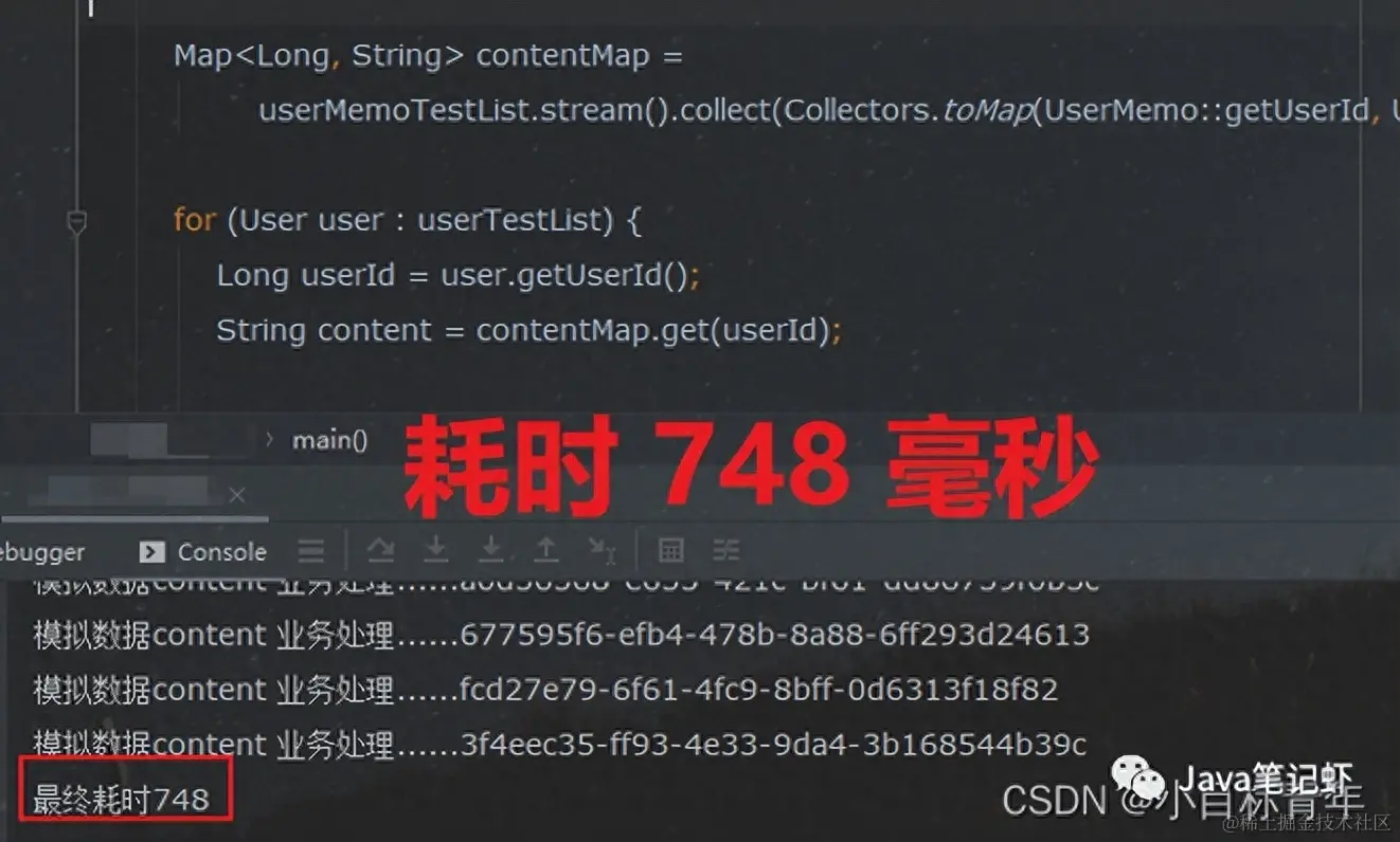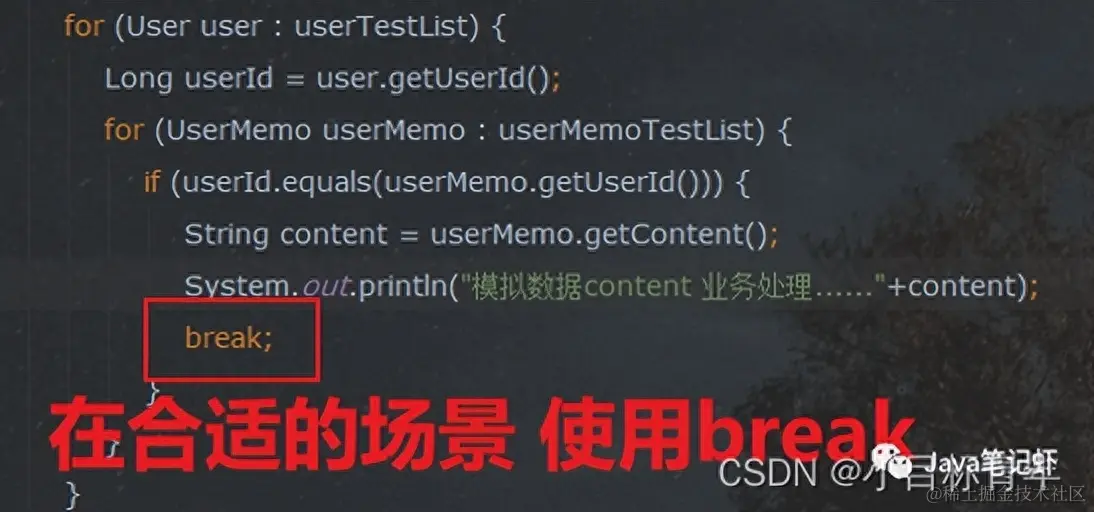 这其实就是时间复杂度,for循环嵌套for循环,就好比 循环每一个 user ,拿出 userId 需要在里面的循环从 userMemo list集合里面 按顺序去开盲盒匹配,拿出第一个,看看userId ,拿出第二个,看看userId ,一直找匹配的。