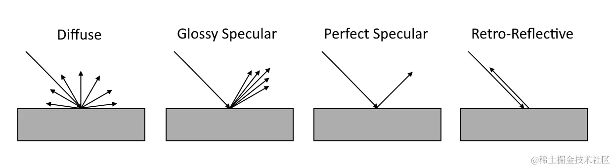 有四种具有反射分布函数 (BRDF) 的一般表面类型,用于描述光向所有方向散射的概率: