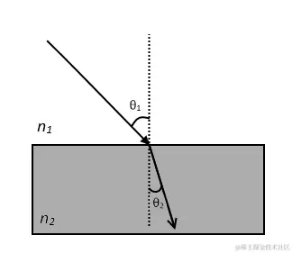 为了讨论这与反射有何不同,请考虑穿过表面的单条光线,例如完美镜面透射的情况。对于完美的镜面透射,光继续传播的角度取决于介质的折射率。这遵循斯涅尔定律,该定律使用等式描述n1θ1= n2θ2.