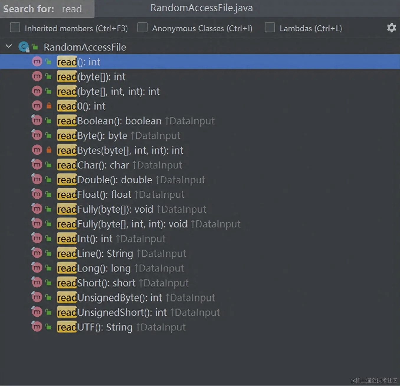 它的实现基于文件指针(一种游标或者指向隐含数组的索引),文件指针可以通过getFilePointer方法读取,也可以通过seek方法设置。