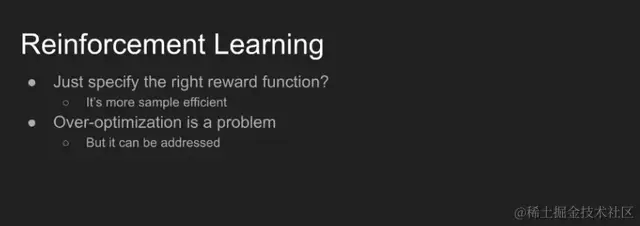 在某种程度上,我们确实可以做到这一点,并且还能取得不错的效果,尽管我们确实会遇到早期对齐思考者假设的过度优化问题。例如,优化奖励函数或者优化从人类教师那里学到奖励模型可能会非常容易,但我们也很容易就会学到一些意料之外的东西。强化学习的过程非常复杂,事实上,强化学习还具备一定的创造性。