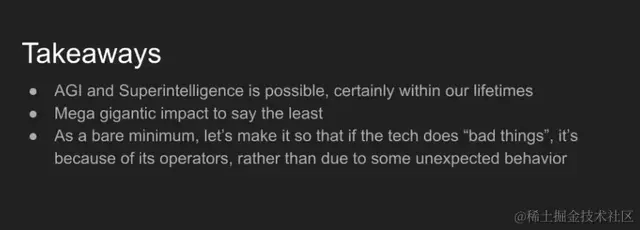 总的来说,通用人工智能和超级智能有可能出现,而且可能将在短期内实现。 虽然很难给出确切时间点,但相关进展确实发展得非常迅速,因此我们不应该局限于现有观念,不应该对其潜力设限。
