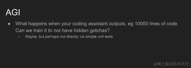 最后,让我们尽情展开想象,来探讨通用人工智能这一终极目标。当你编程的 AI 输出了成千上万行的代码时,会发生什么?这将是一个庞大程序。你可以进行一些单元测试,甚至可以与这个程序交互。