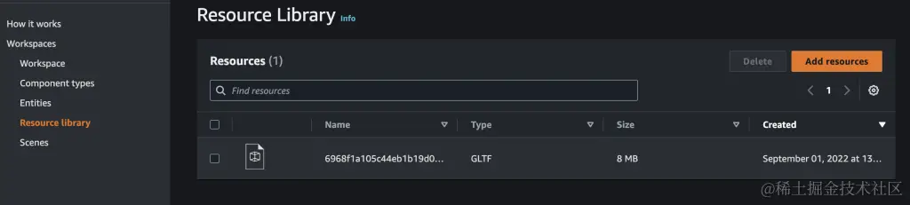 - 在 IoT TwinMaker 工作区中,在 “资源”部分中上传 glTF 模型。如果您尚未创建工作区,请按照 AWS IoT TwinMaker 入门中的步骤操作。