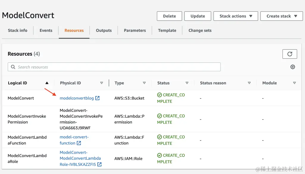 完成后,导航到新的 S3 存储桶。可以在“资源”选项卡下找到一个链接