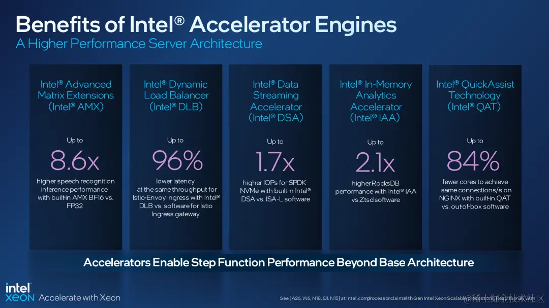 通过加速器承载如数据传输、分析、加解密、压缩等关键任务,SPR 系列处理器可以提升特定工作负载的性能,同时释放 CPU 资源用于处理其他业务。加速器内置到 CPU 中,避免了向外部传输数据的瓶颈和时延,也从整体上降低了系统成本和复杂度。