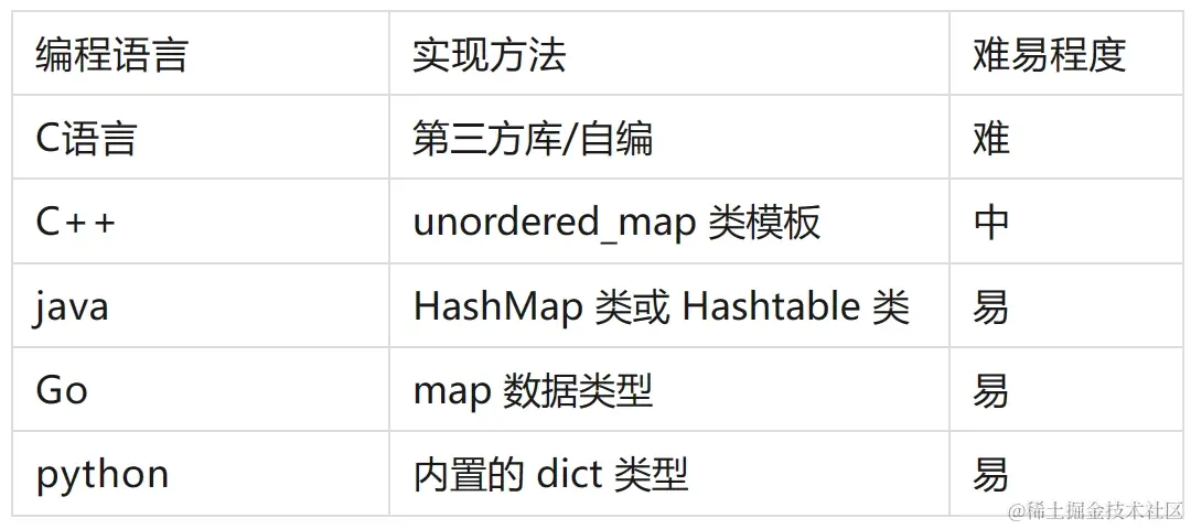 无论使用哪种编程语言,哈希表的基本操作和概念都是相似的,但具体实现细节可能会有所不同。需要注意的是,每种语言的哈希表可能具有不同的性能特性和限制,请根据具体需求选择适合的哈希表实现。