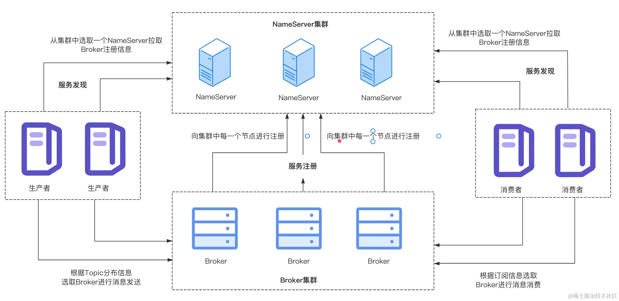 以生产者为例,在NameServer集群部署模式下,生产者会从多个NameServer中随机选取一个进行通信,从中拉取所有Broker的注册信息,并将拉取到的信息进行缓存,生产者知道了Broker的信息后,就可以得知Topic的分布情况,然后选取一个消息队列,与其所在的Broker通信进行消息的发送。如果通信的Nameservre宕机,消费者会轮询选择下一个NameServer。