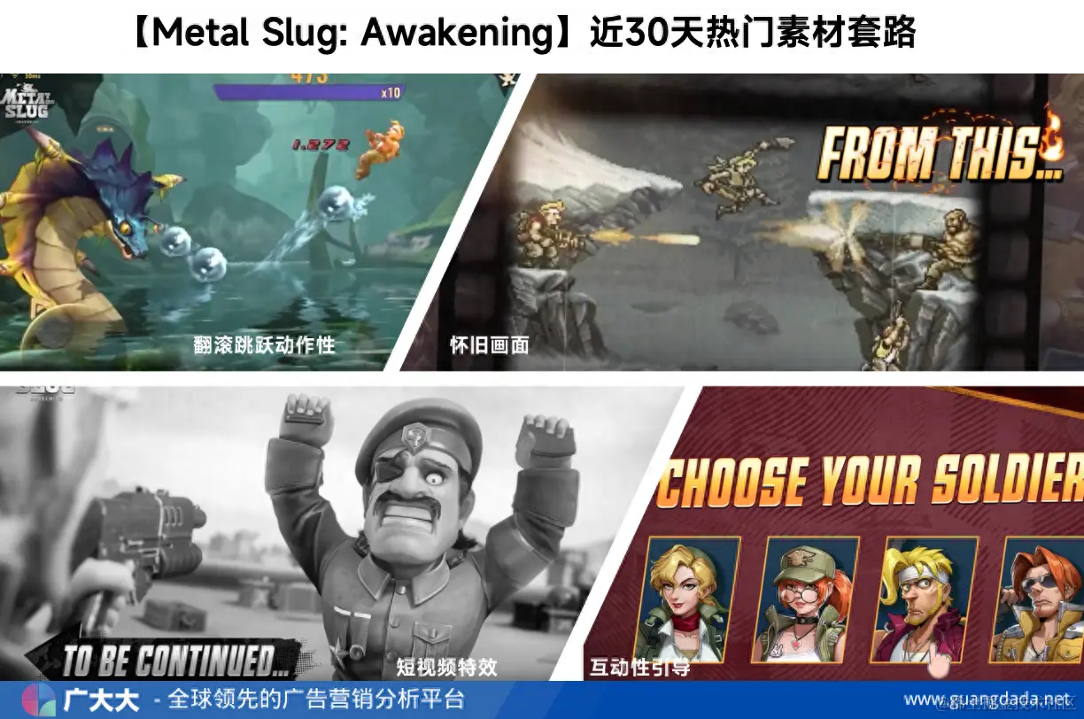 在视频素材制作上,【Metal Slug:Awakening】以“情怀、玩法、道具、反转”为主要套路。与此同时,为了契合短视频平台用户喜好,素材配乐强劲有力、视频本身短小精悍,根据广大大抓取数据显示,30s以内市场视频素材占比高达83%。