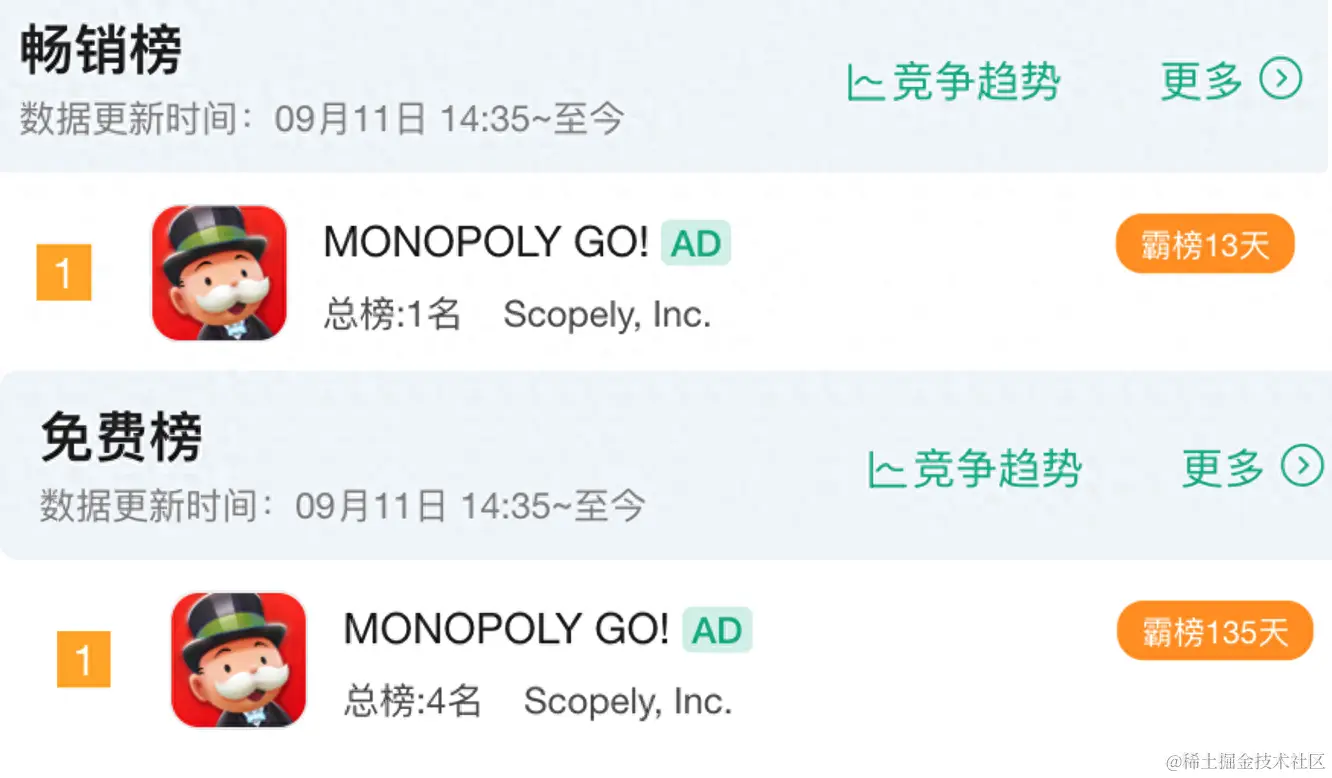 数据来源:七麦数据,9月12日【MONOPOLY GO!】美国AppStore游戏榜单排名