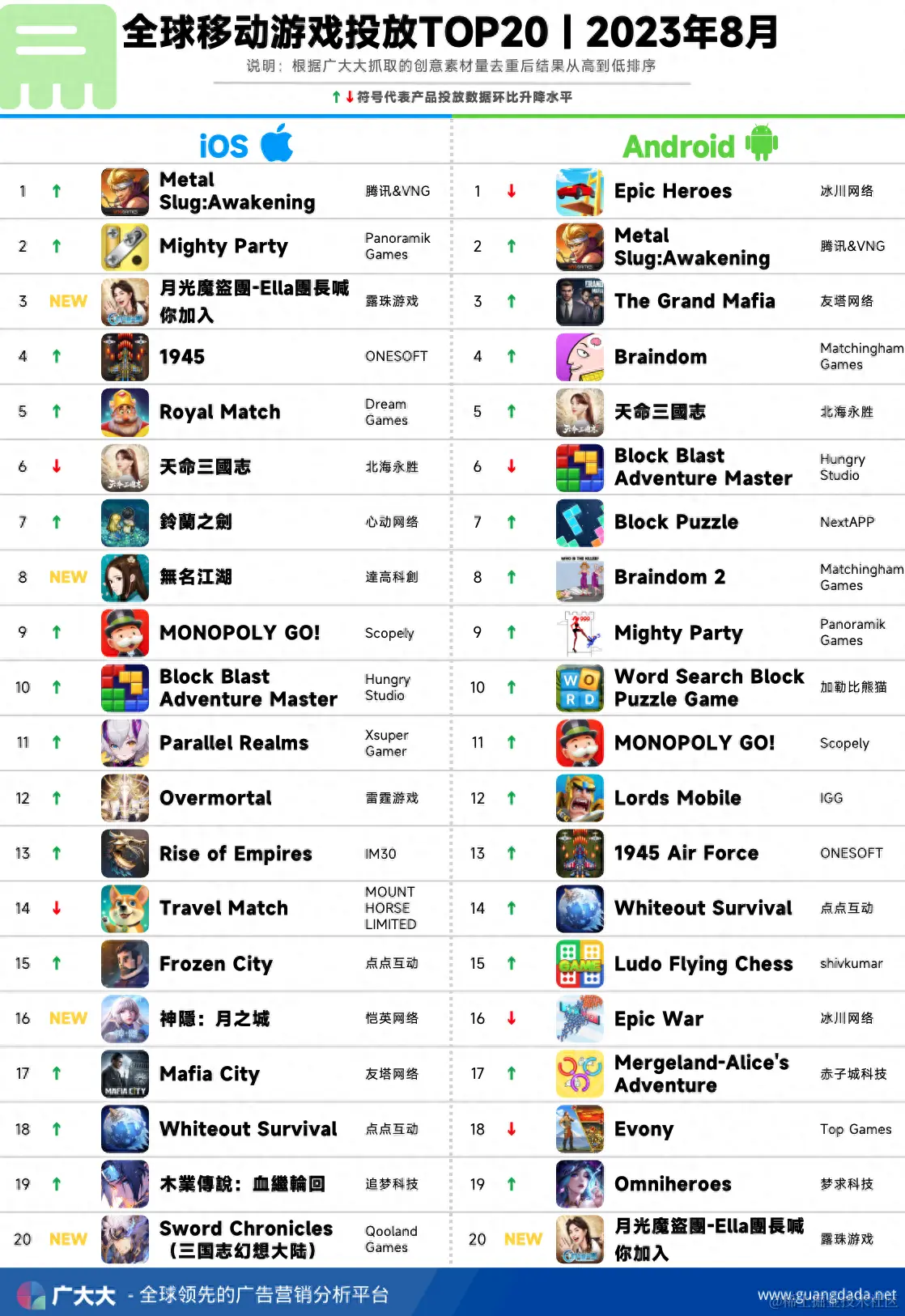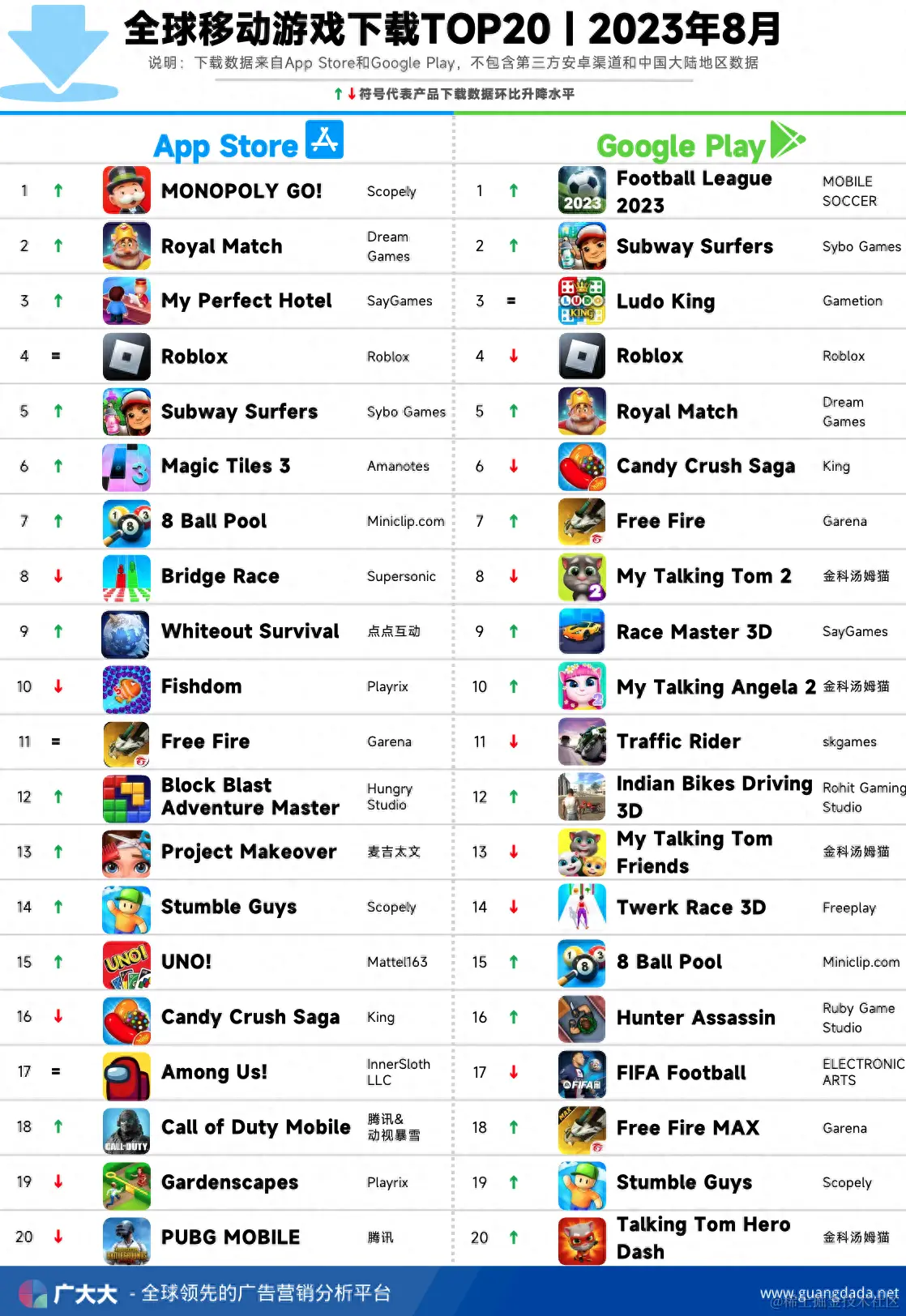 根据广大大——App Intelligence等模块数据,我们整理出2023年8月全球成功手游投放、收入和下载TOP20榜单,帮助更多移动应用从业人员了解全球移动市场变化趋势。