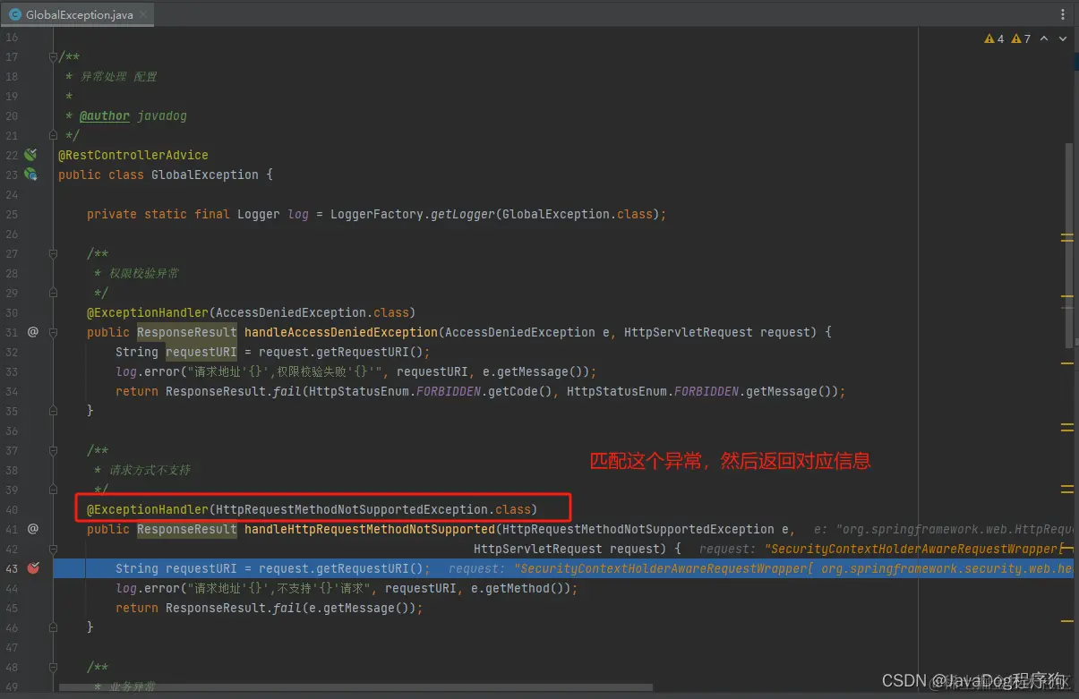 在使用上方统一返回结果的加持下,规范的同时也不可避免程序异常情况。因此我们必须提前定义一个统一全局异常来捕获这些异常信息,并将其当作一种结果返回给控制层,友好的处理异常信息。