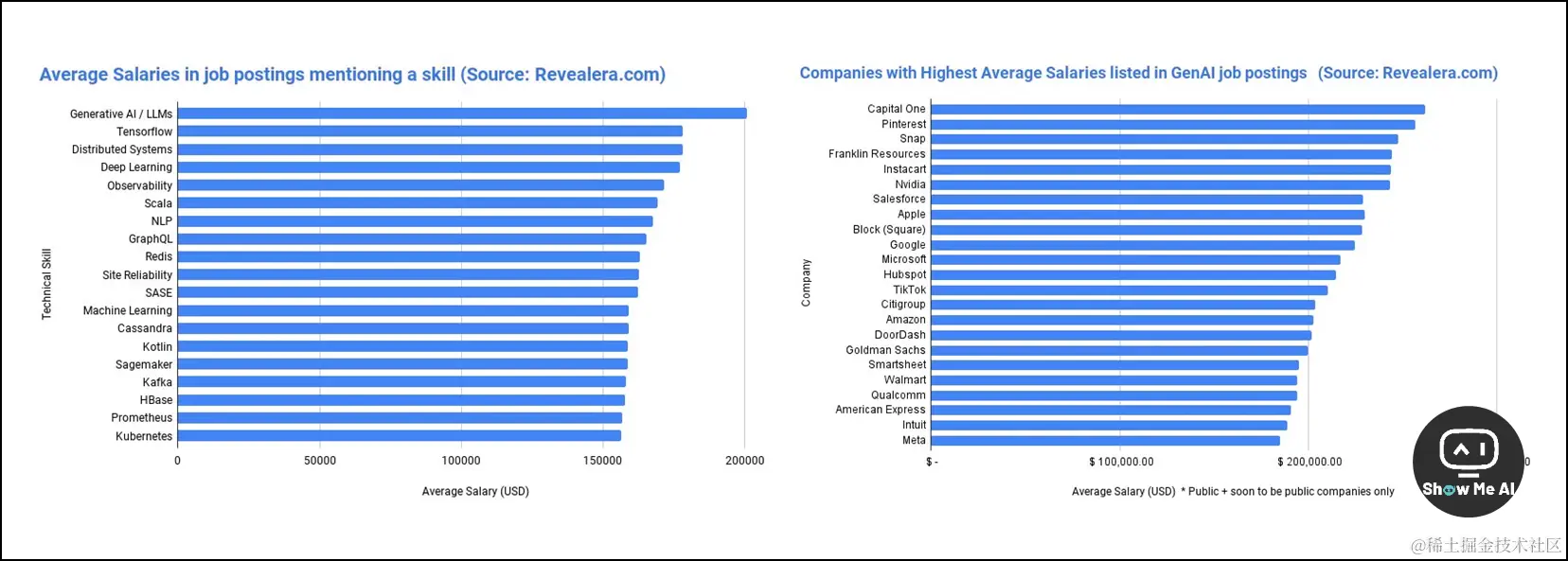 在跟踪的所有技术栈中,提到「Generative AI」或「LLM」的岗位提供了最高平均工资,高达每年20万美元。