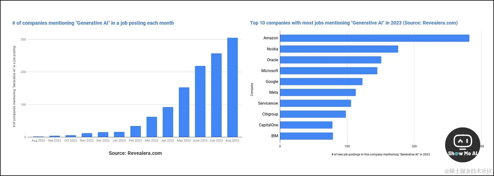 2023年以来,GenAI 人才的需求呈现指数级的增长。按照招聘数量来看,Amazon、Nvidia、Oracle、Microsoft、Google、Meta 等科技行业的头部企业自不必说,Citigroup (花旗集团) 和 CapitalOne 等大银行也在这一领域大举招聘。