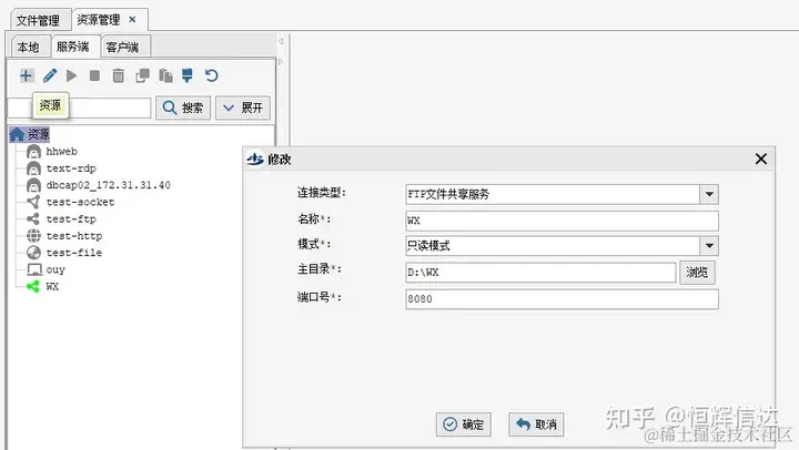 FTP文件共享服务 恒辉信达 2023-09-15 125 阅读1分钟 实际工作中,经常会需要共享本地文件夹。 本篇介绍HHDESK的FTP共享服务,仅需一个步骤即可创建共享连接。 1 新建连接 首页——资源管理——服务端——“+”,在弹出框中选择FTP代理服务。 填写各个选项,选择需要共享的文件夹。 点击确定。 地址如下,格式为“ftp://IP:端口号/” 2 使用方式 右键连接,选择“运行” 其他用户只需在地址框中输入文件夹地址,即可访问。 右键连接,选择“停止”,即可关闭共享。