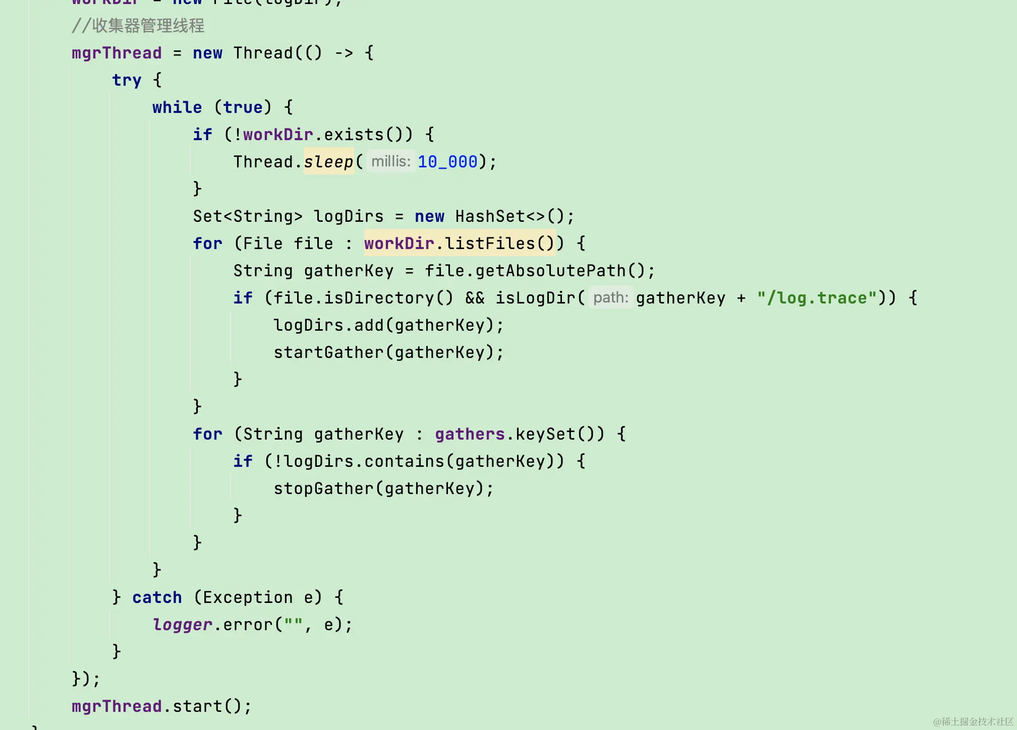 最后发现此处代码是一个死循环,一直在监测日志文件状态,并且无等待