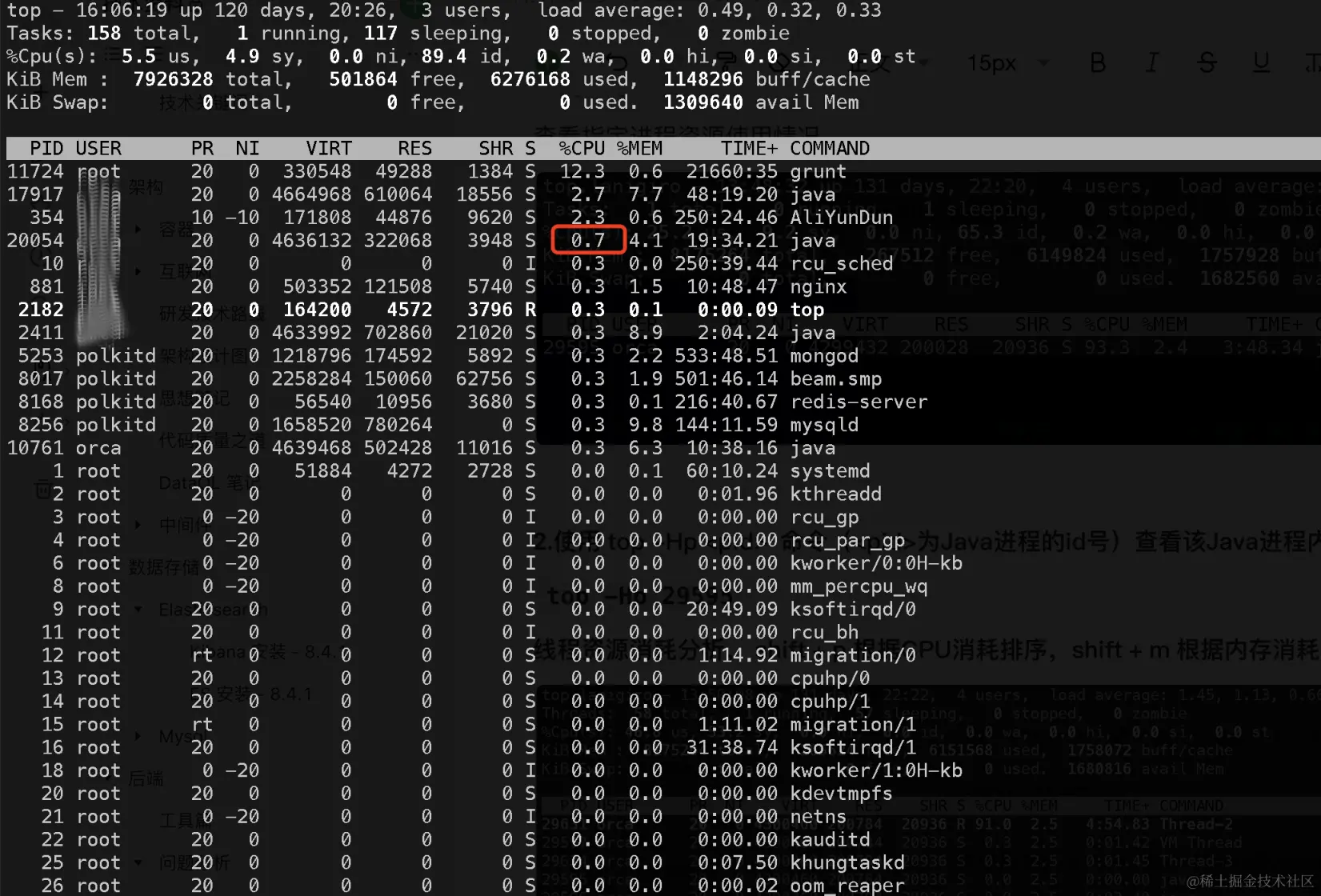 top 资源消耗分析, shift + p 根据CPU消耗排序,shift + m 根据内存消耗排序