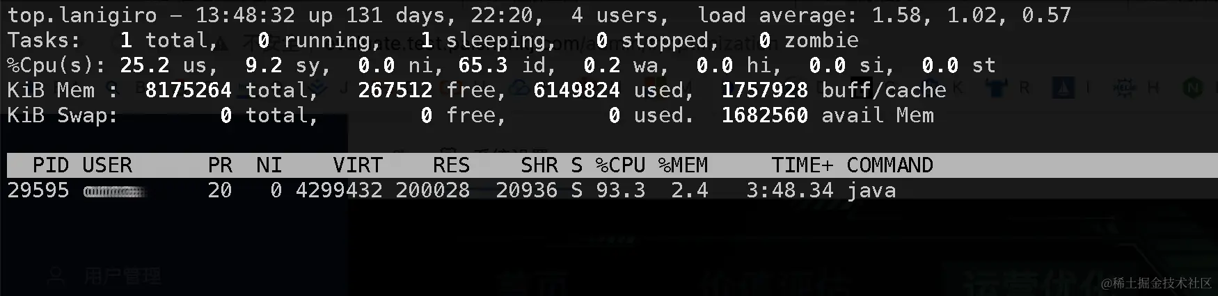 1.使用 top -p 命令(为Java进程的id号)查看Java进程的cpu占用: