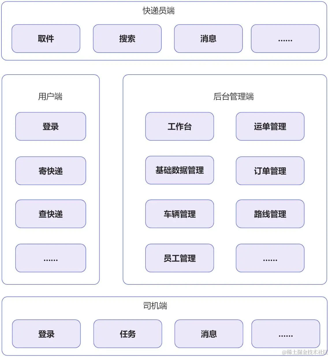 神领物流系统类似顺丰速运,是向C端用户提供快递服务的系统。竞品有:顺丰、中通、圆通、京东快递等。 项目产品主要有4端产品: